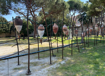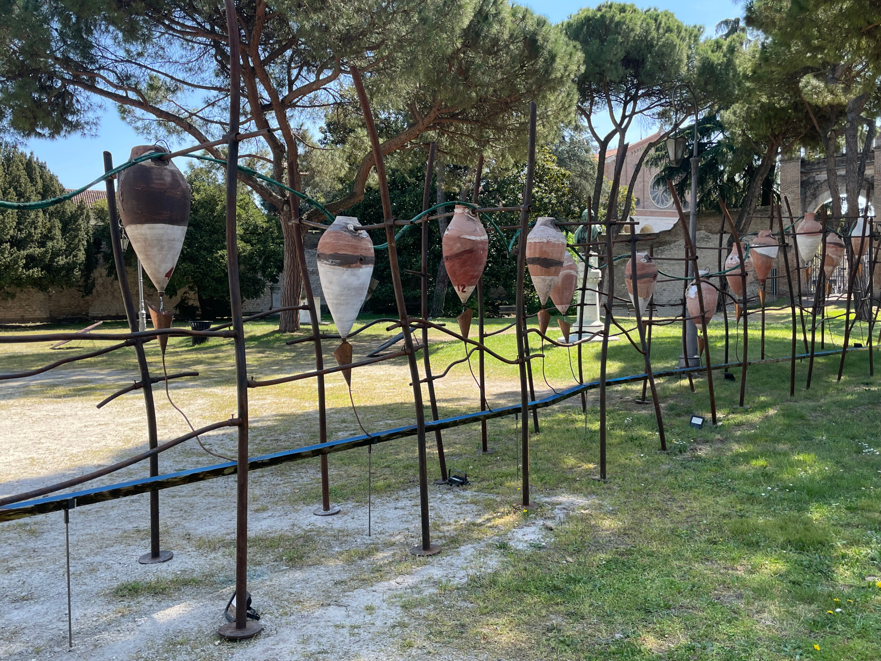 Ievolella ha voluto inserire accanto all’installazione un altro richiamo al mondo arcaico e al tema dell’acqua come fonte di vita. Ha scelto la Stele funeraria di Ostiala Gallenia, conservata nel Museo Archeologico e lo ha tradotto in forma di scudo, che si trova adagiato sull’erba, vicino ad alcuni resti dell’antico acquedotto che anticamente portava l’acqua in città.