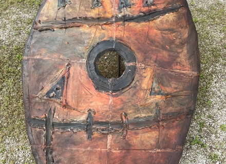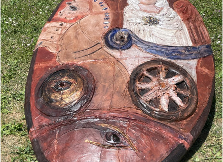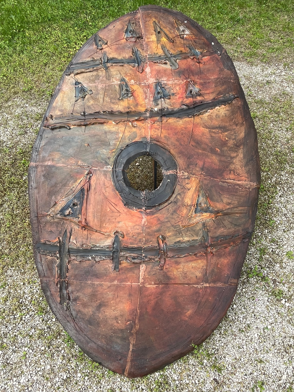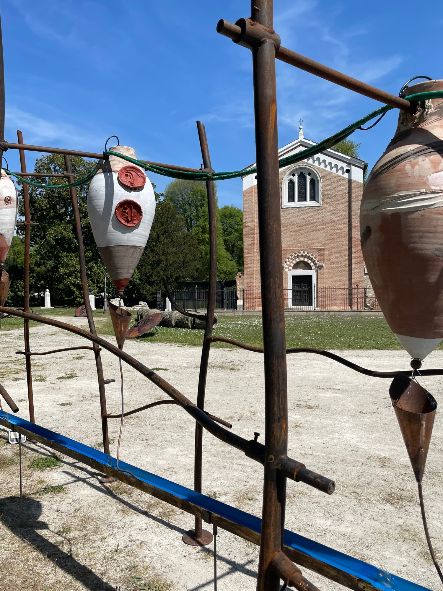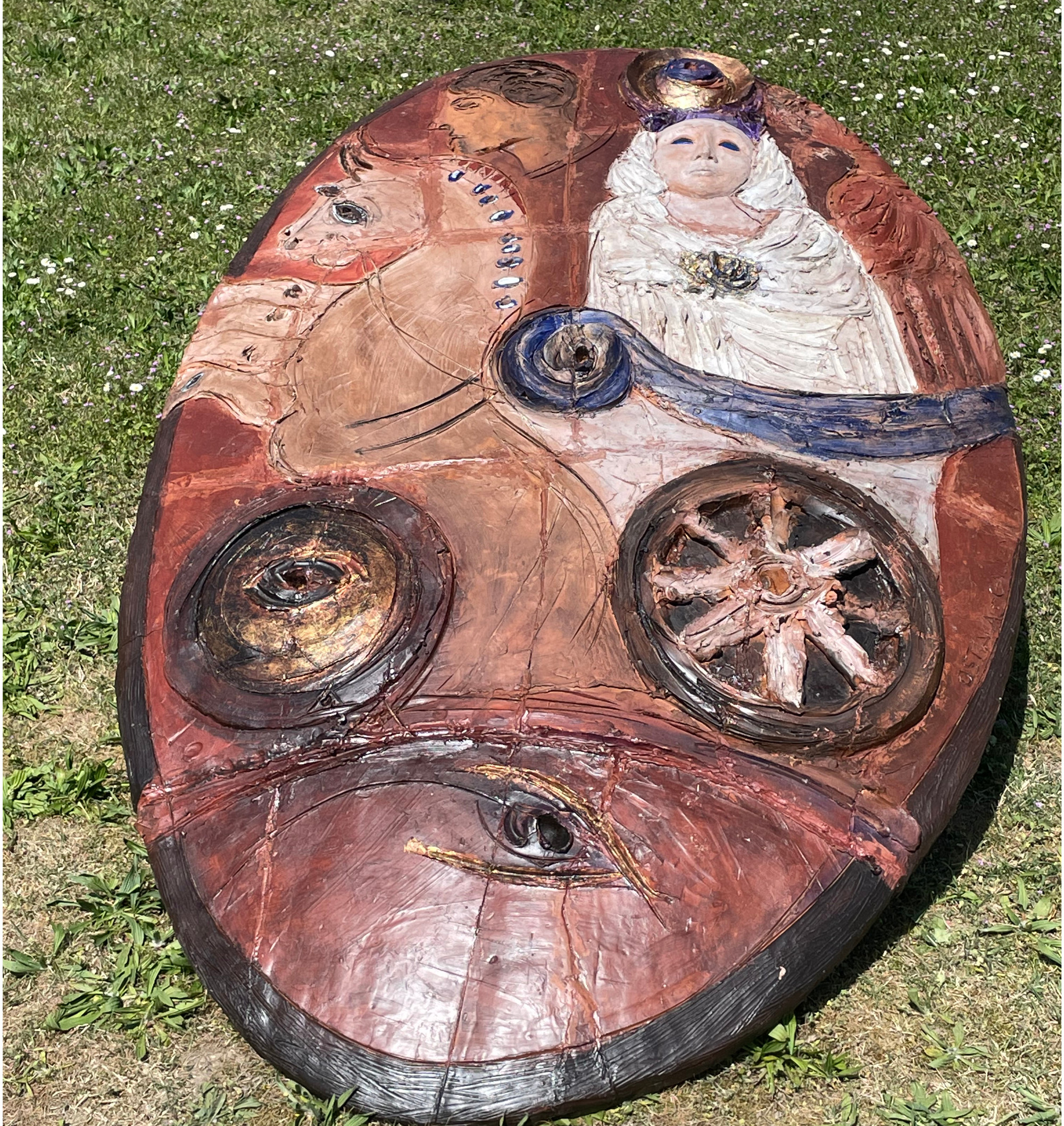 Sul prato antistante la Cappella degli Scrovegni è adagiata una bellissima serie di scudi anch’essi in terracotta. Queste opere sono state create dal maestro nel 2021, quando “Fons vitae” è stata esposta a Pavia nel Castello Visconteo-Sforzesco e trovavano posto nel grande porticato del castello, accanto a reperti archeologici. Raccontavano la dimensione militare del luogo in cui erano ospitate.