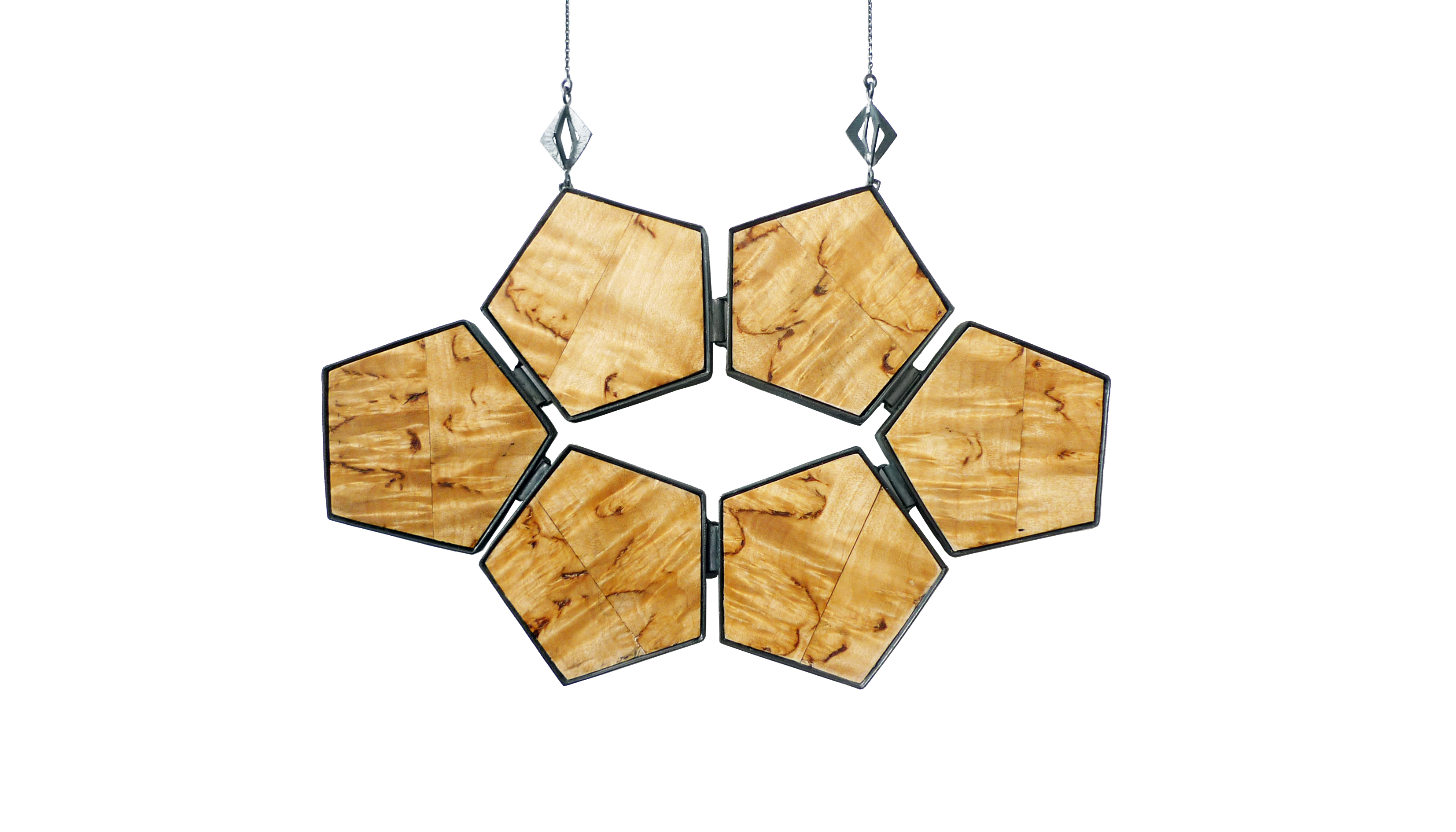 Hanna Liljeberg Trae ispirazione dalle coste lambite dall’Oceano, frastagliate e abrase dal vento e dallanatura magica degli acquarelli di John Bauer. Con un procedimento paziente di taglio, piegatura e colore trasforma la carta e il metallo in strutture organiche, dinamiche, complesse, tutte da indossare.